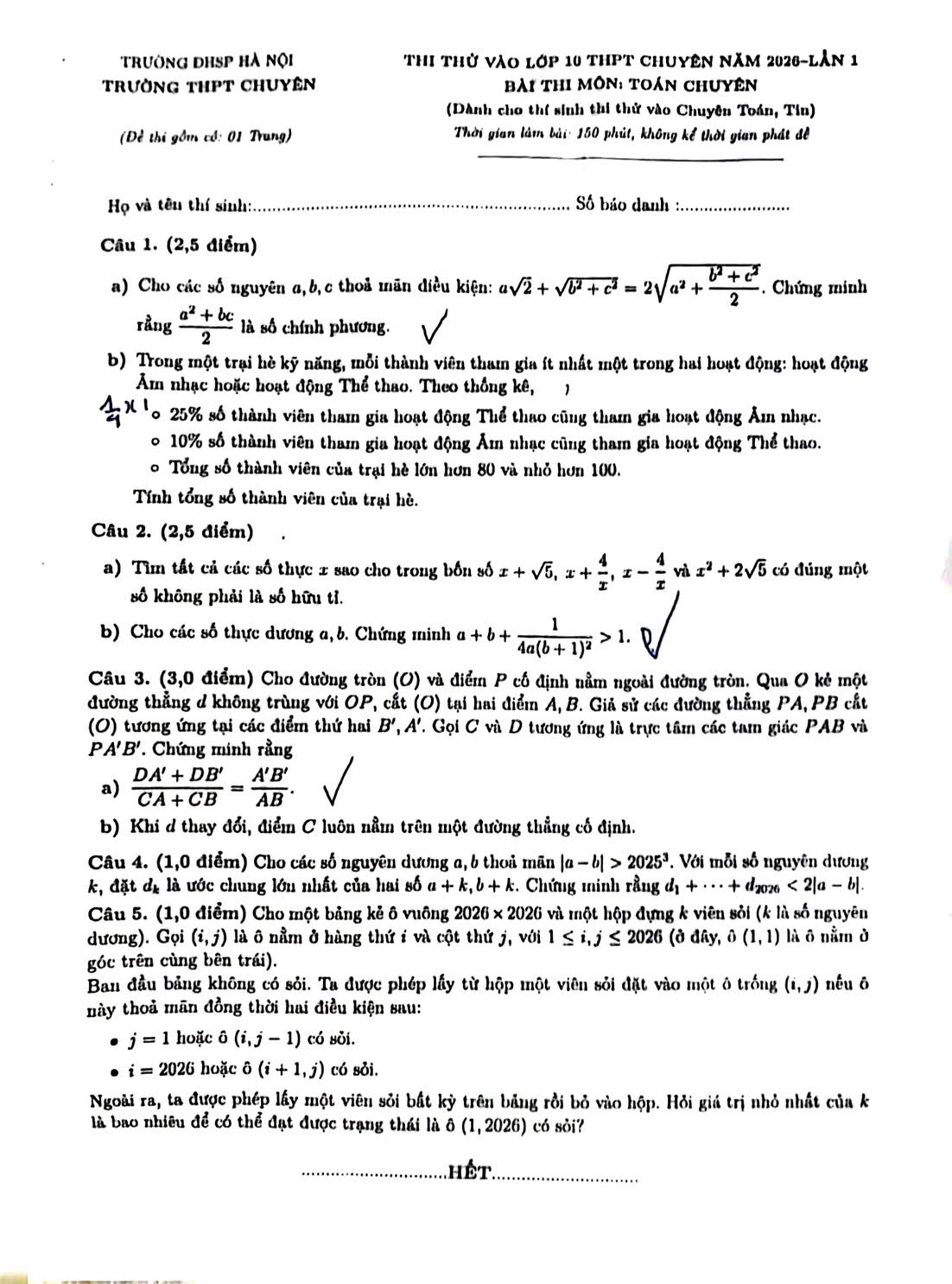 Đề thi thử Toán chuyên, Trường THPT chuyên Sư phạm lần 1, năm 2026