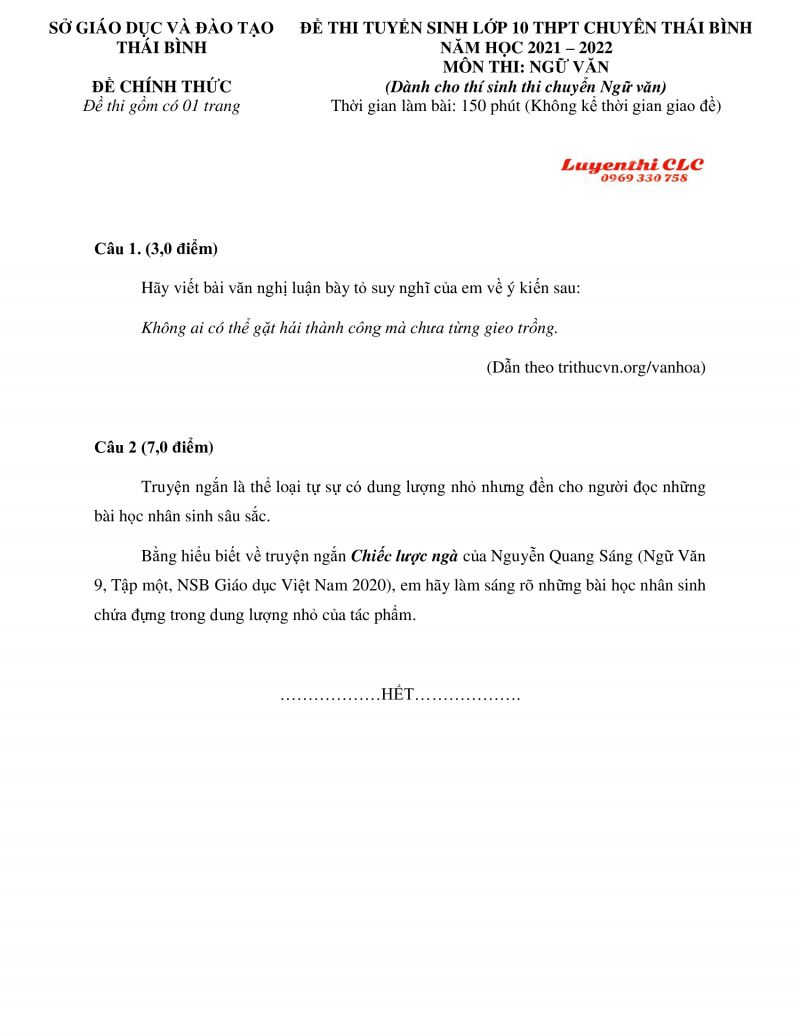 Đề thi tuyển sinh vào lớp 10 THPT môn Ngữ Văn tỉnh Hải Dương năm 2021