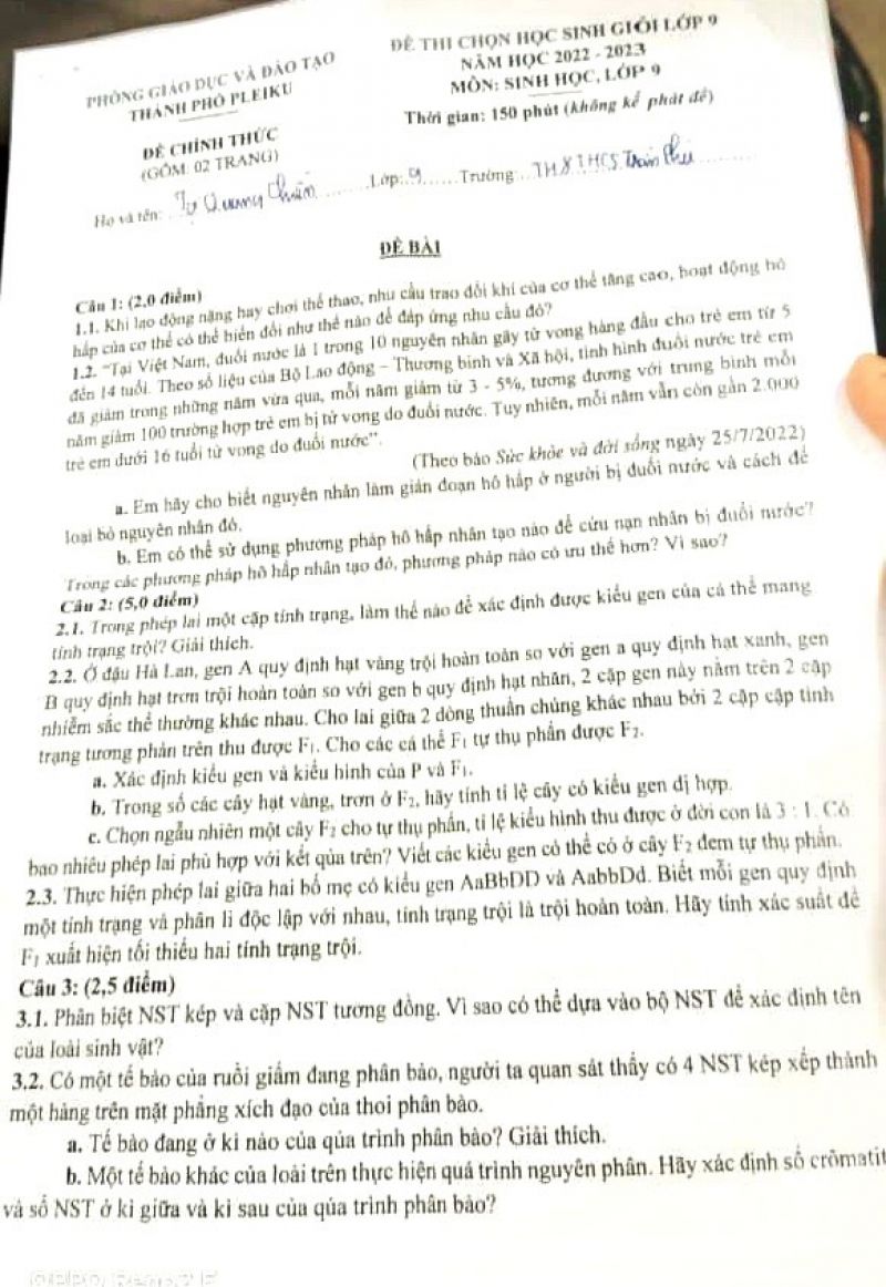 Đề thi chọn HSG môn Sinh học lớp 9 tại Huế năm 2023