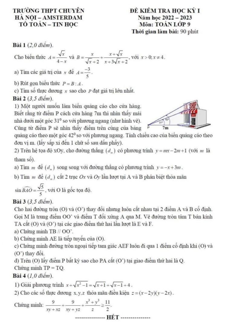 Đề thi chọn đội tuyển HSG môn Toán lớp 9 Trường THPT Chuyên Hà Nội Amsterdam năm 2023
