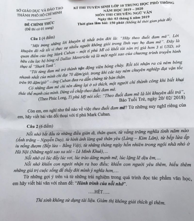 Đề thi tuyển sinh vào lớp 10 THPT môn Ngữ Văn tỉnh Tiền Giang năm 2020