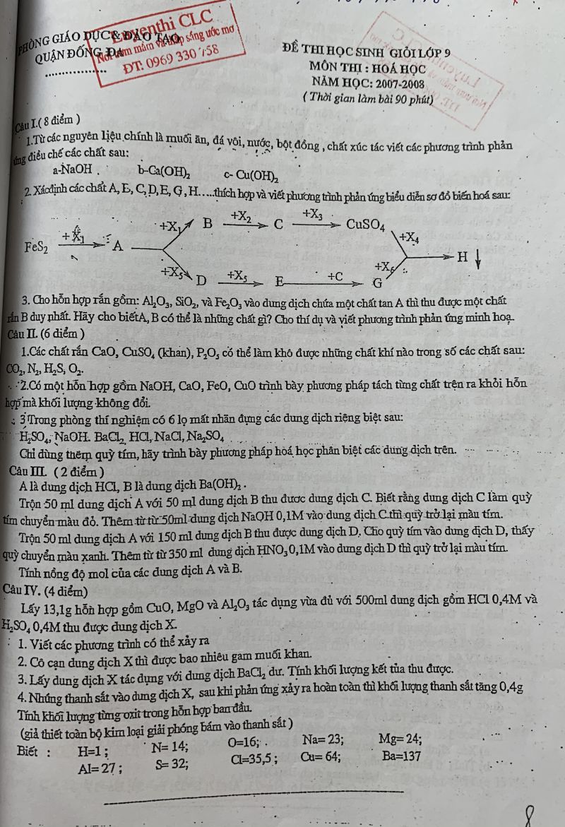 Đề thi tuyển sinh vào lớp 10 THPT môn HÓA HỌC Hà Nội năm 2020
