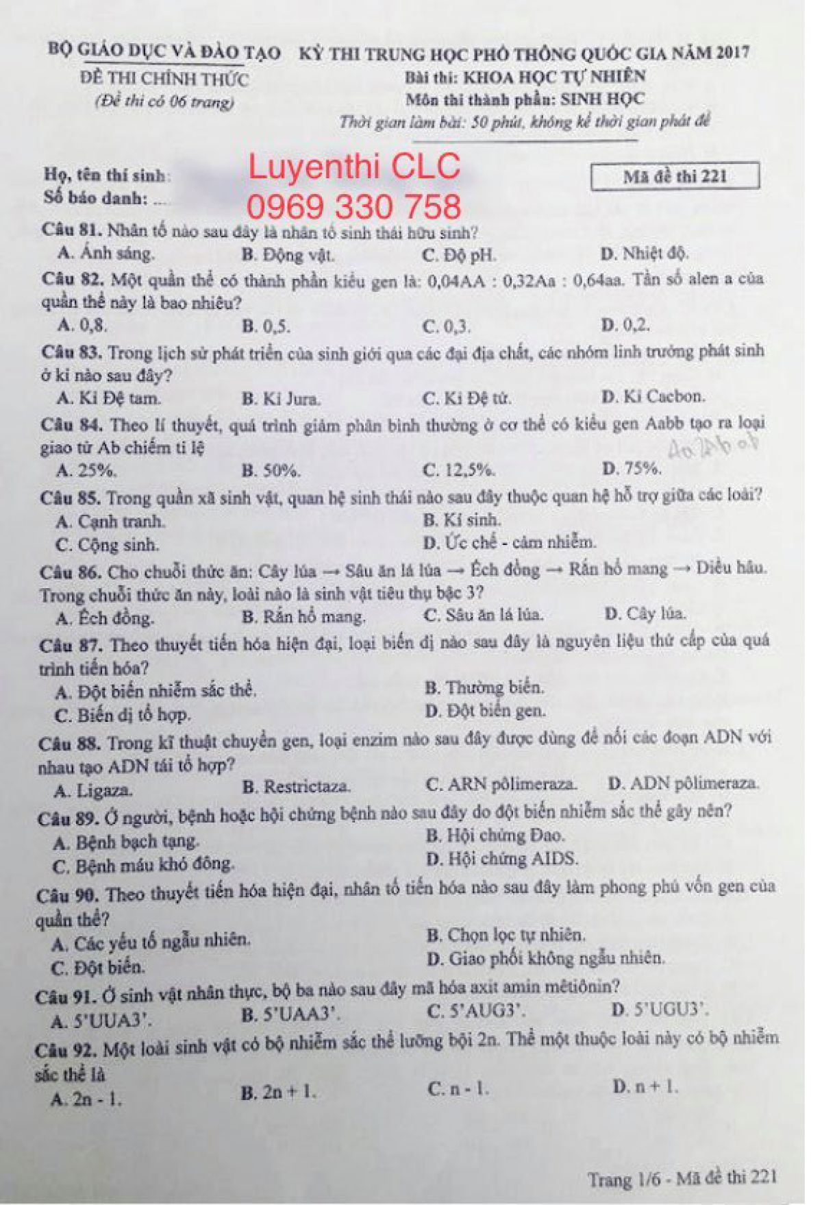 Đề thi THPT quốc gia môn Sinh học năm 2017 Mã đề 204