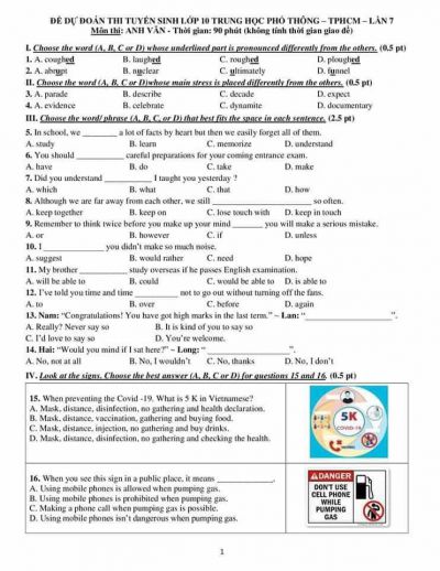 Đề dự đoán thi tuyển sinh vào lớp 10 THPT - TPHCM - Lần 7 và đáp án môn Anh Văn