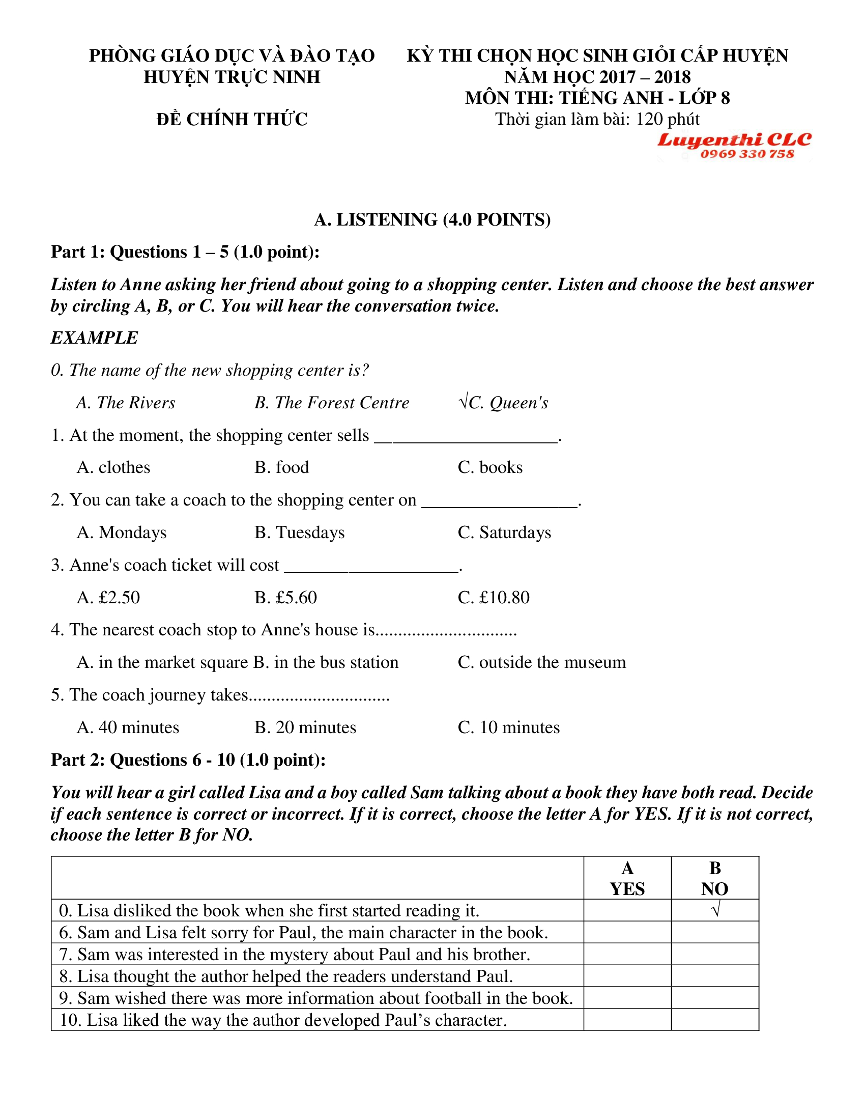 Đề thi chọn HSG môn Tiếng Anh lớp 8 huyện Trực Ninh tỉnh Nam Định năm 2018