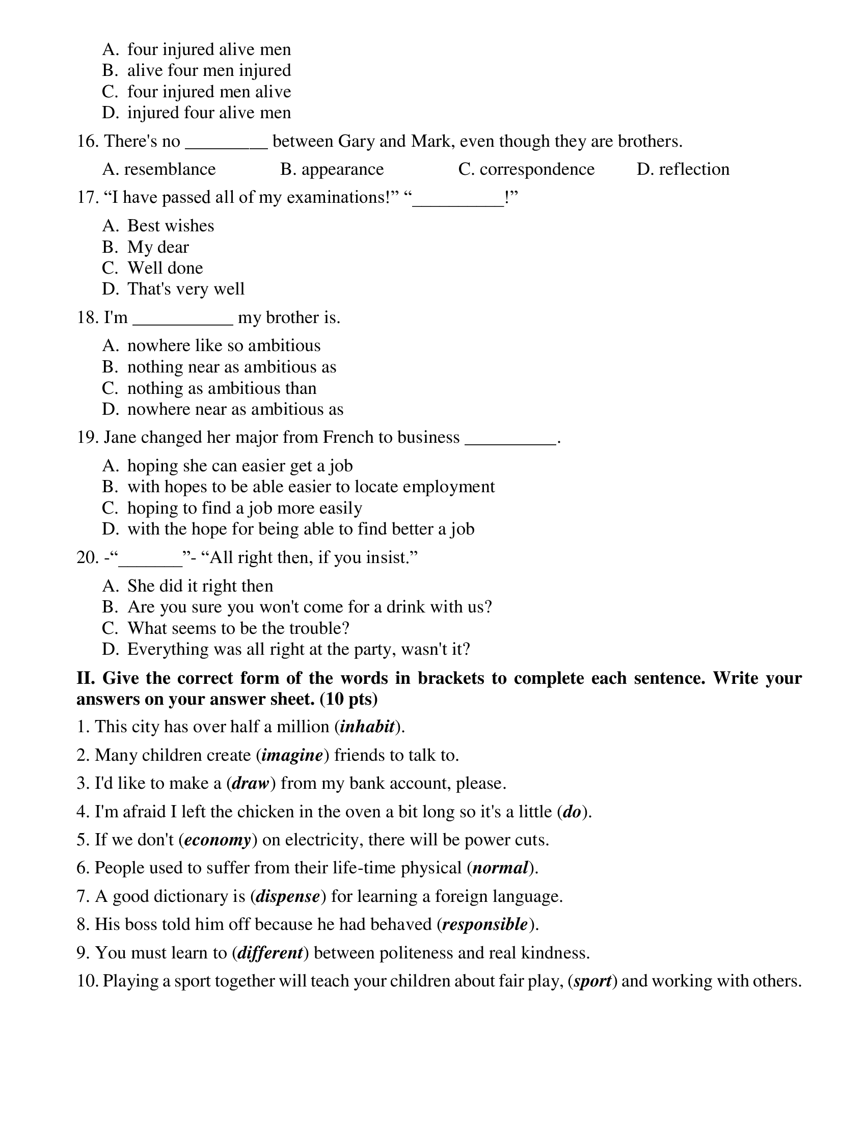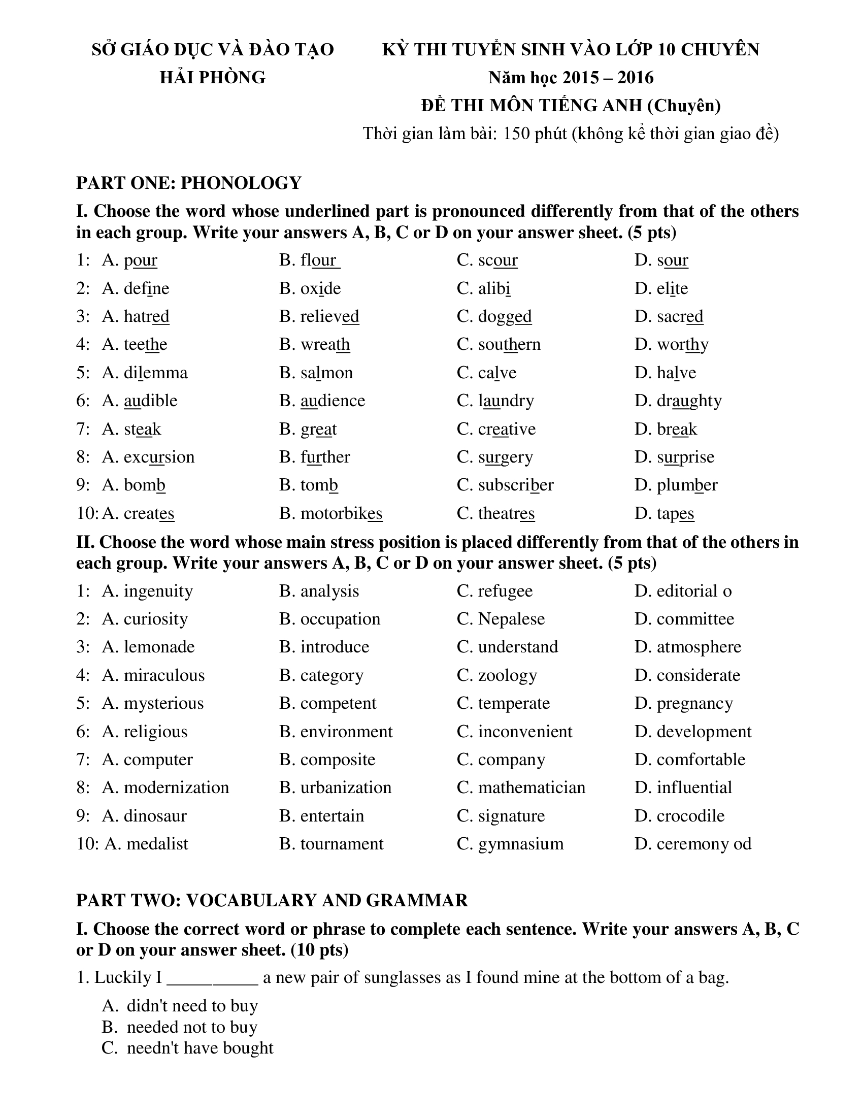 Đề thi tuyển sinh vào lớp 10 môn Tiếng Anh (Chuyên) tại Hải Phòng năm 2016