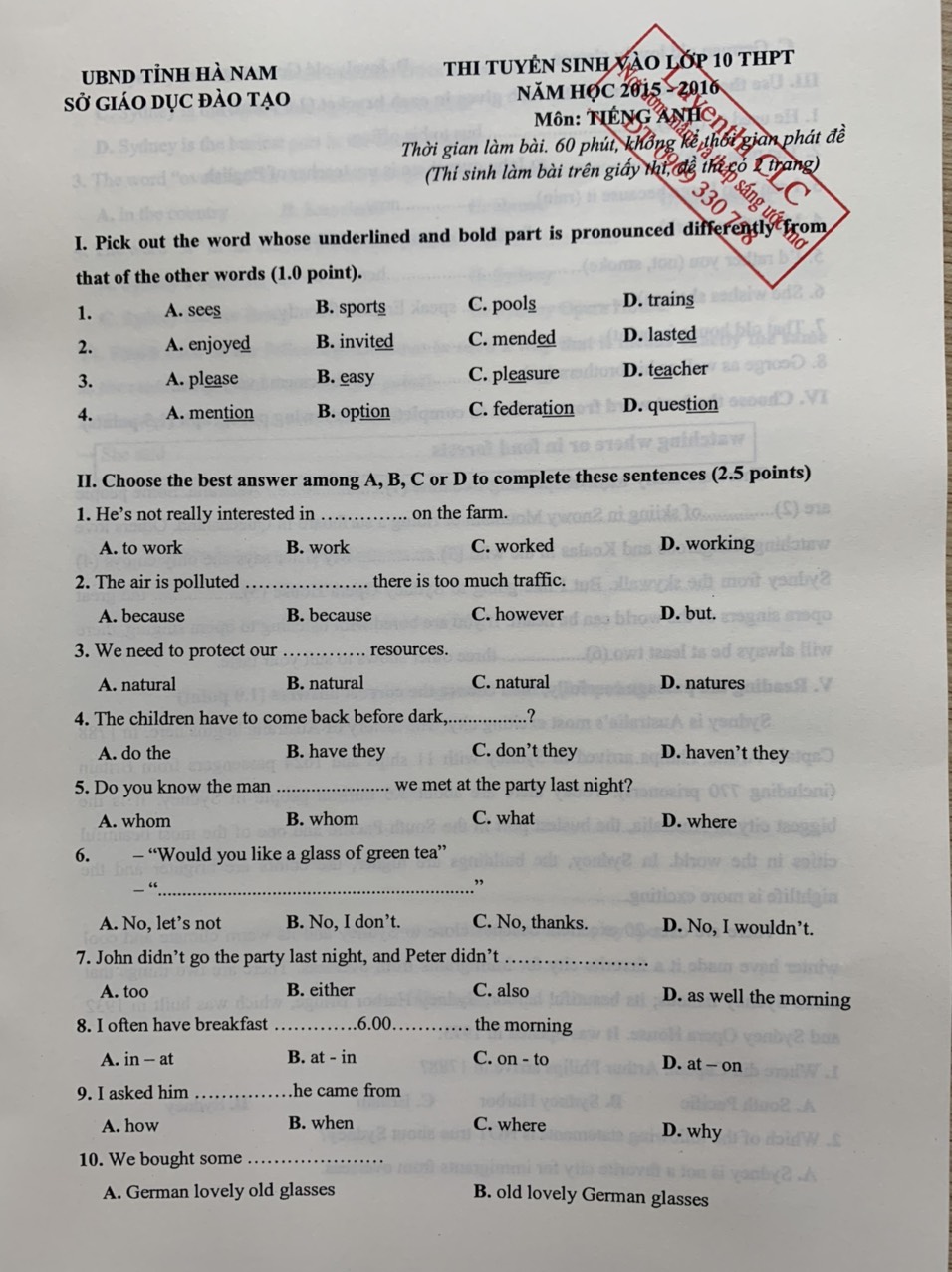 Đề thi tuyển sinh vào lớp 10 THPT môn Tiếng Anh tỉnh Hà Nam năm 2015