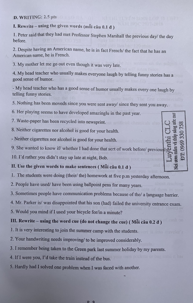 Đề thi thử vào 10 THPT môn Tiếng Anh theo CT GDPT 2018- Trường Đại học Ngoại Ngữ