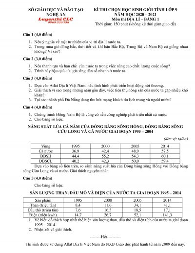 Đề thi chọn HSG tỉnh môn Địa Lý lớp 9 - Bảng 1 tỉnh Nghệ An năm 2020
