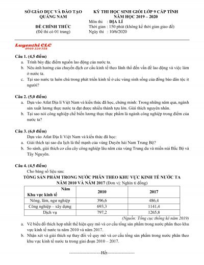 Đề thi HSG môn Địa Lí lớp 9 tỉnh Quảng Nam năm 2020
