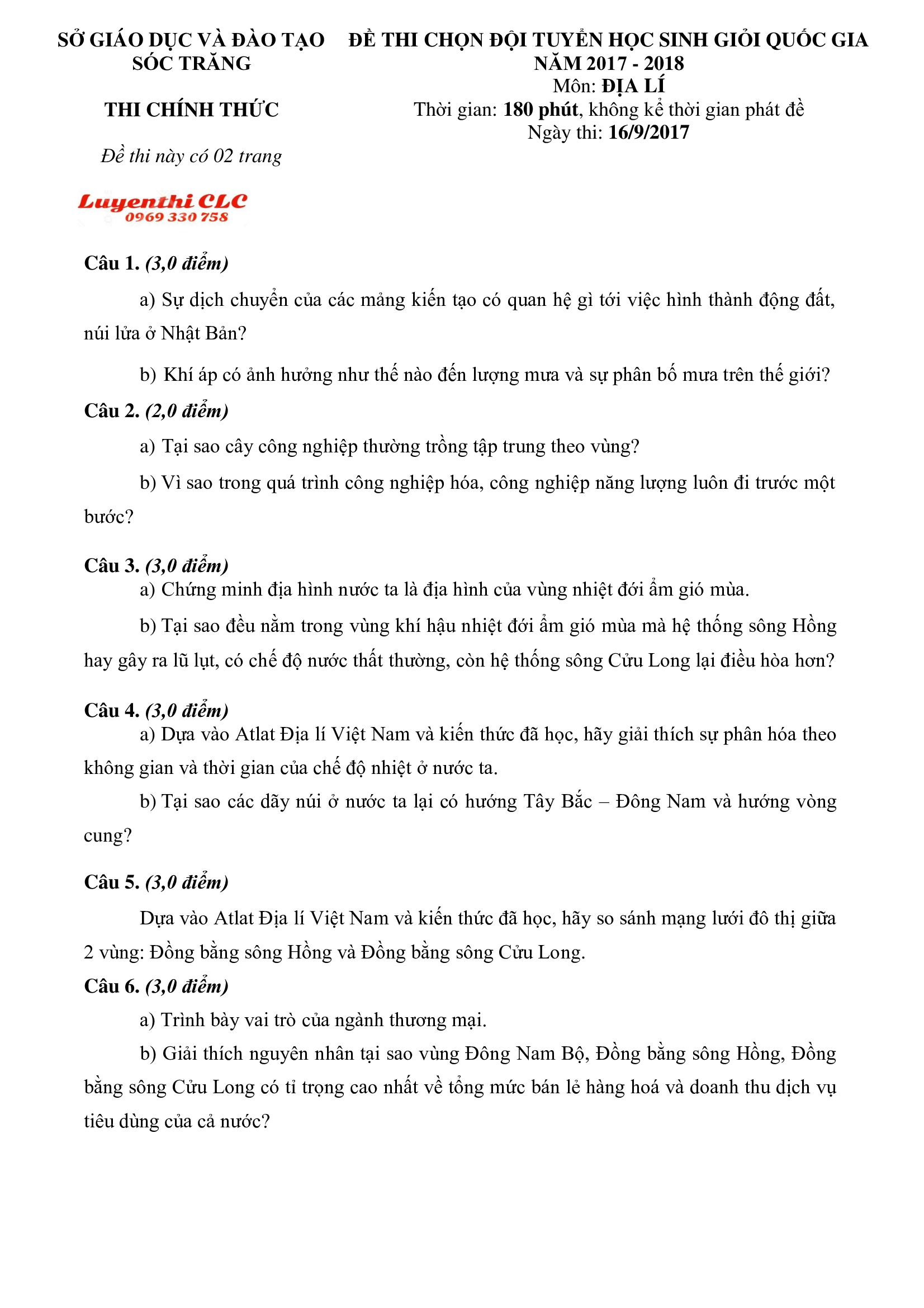 Đề thi chọn đội tuyển HSG Quốc Gia môn Địa Lí - đề số 2 tỉnh Sóc Trăng năm 2017
