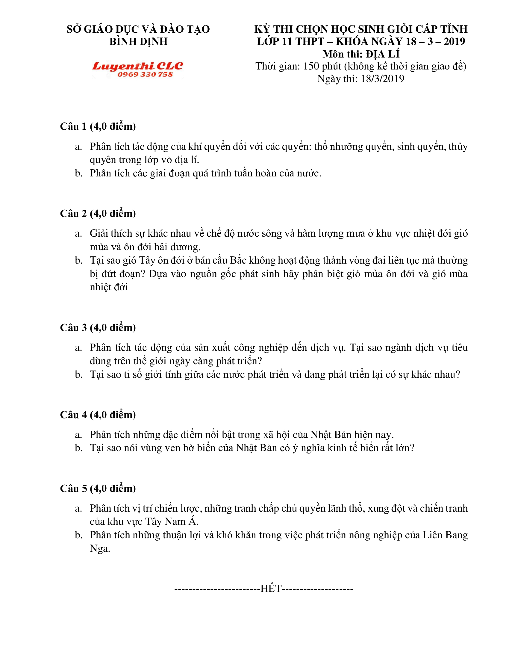 Đề thi chọn HSG môn Địa Lí lớp 10 tỉnh Bình Định năm 2019