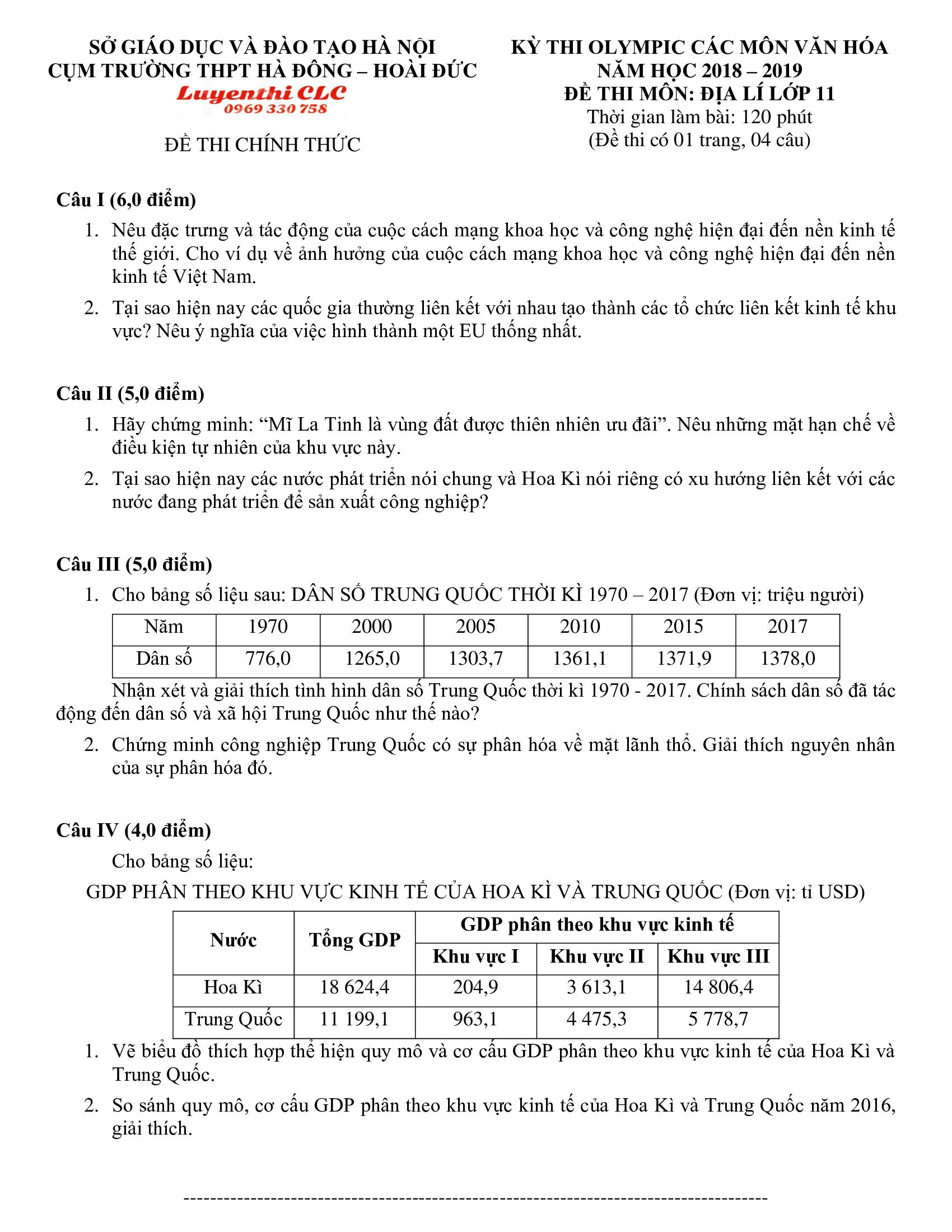 Đề thi Olympic Địa Lí 11 Trường THPT Hoài Đức, thành phố Hà Nội năm 2019