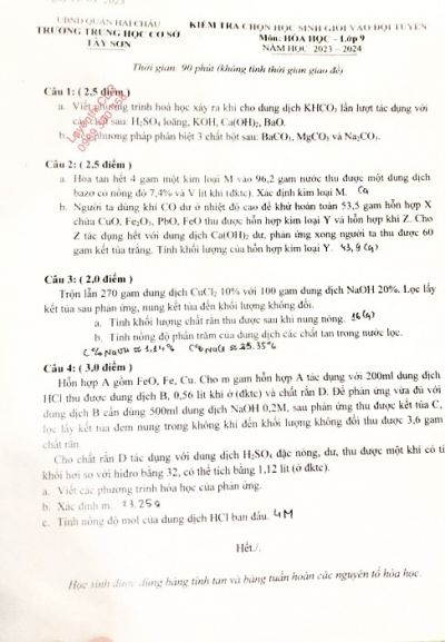 Đề thi chọn HSG môn Hóa Học lớp 9 huyện Tây Sơn, Hà Nội năm 2023