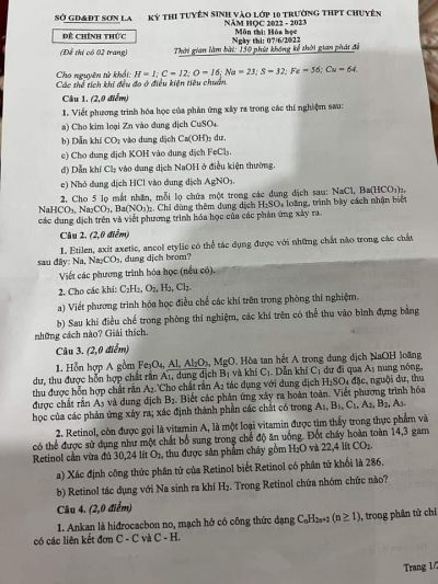 Đề thi tuyển sinh vào lớp 10 môn Hóa Học Trường THPT CHUYÊN Hùng Vương tỉnh Gia Lai năm 2022