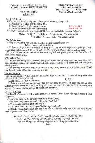Đề kiểm tra giữa học kì II môn Hóa Học lớp 11 Trường THPT Trần Phú, Thành phố Hồ Chí Minh năm 2021