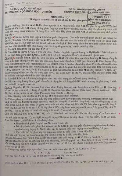 Đề thi tuyển sinh vào trường THPT CHUYÊN môn Hóa Học Trường Đại học Sư phạm Hà Nội năm 2015