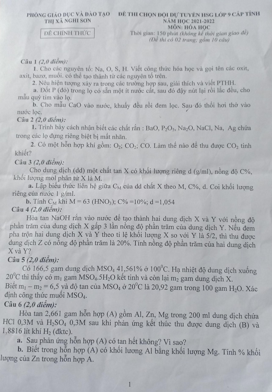 Đề thi chọn HSG môn Hóa Học lớp 9 thị xã Nghi Sơn tỉnh Thanh Hóa năm 2022
