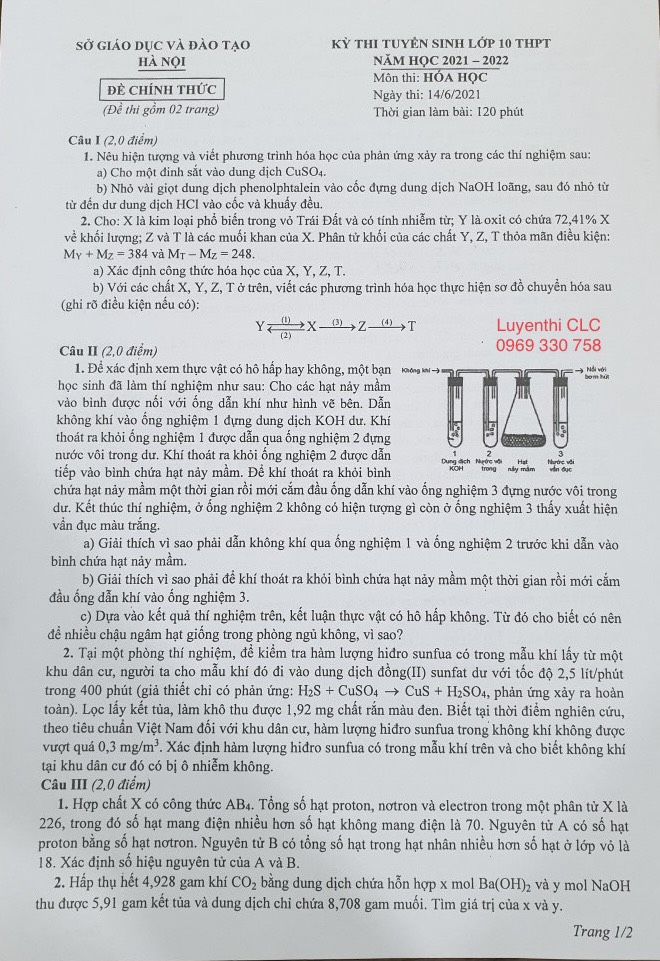 Đề thi tuyển sinh vào lớp 10 THPT môn Hóa Học tại Hà Nội năm 2021