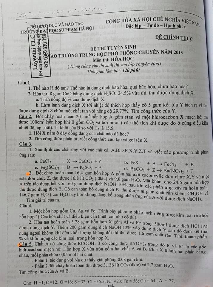 Đề thi tuyển sinh vào trường THPT CHUYÊN môn Hóa Học Trường Đại học Sư phạm Hà Nội năm 2015
