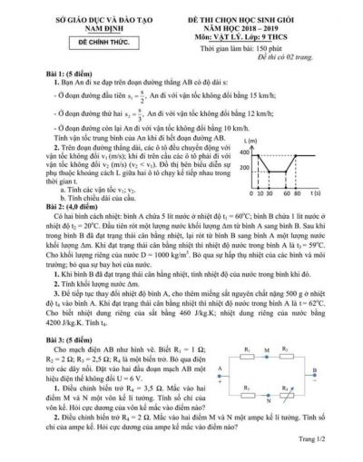 Đề thi chọn HSG và đáp án môn Vật Lí lớp 9 THCS tỉnh Nam Định năm 2019