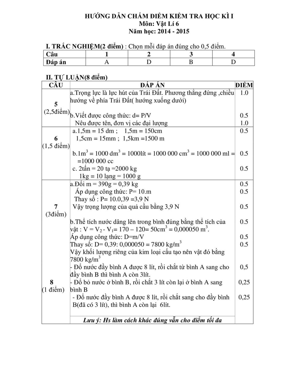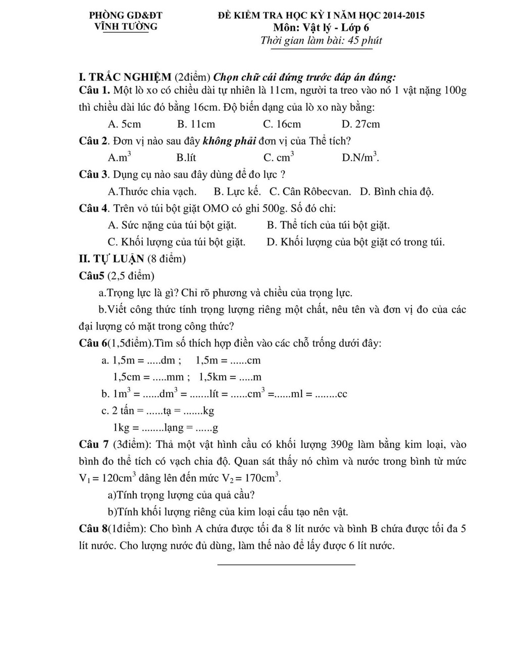 Đề kiểm tra chất lượng học kì I và đáp án môn Vật lý 6 huyện Vĩnh Tường năm 2014