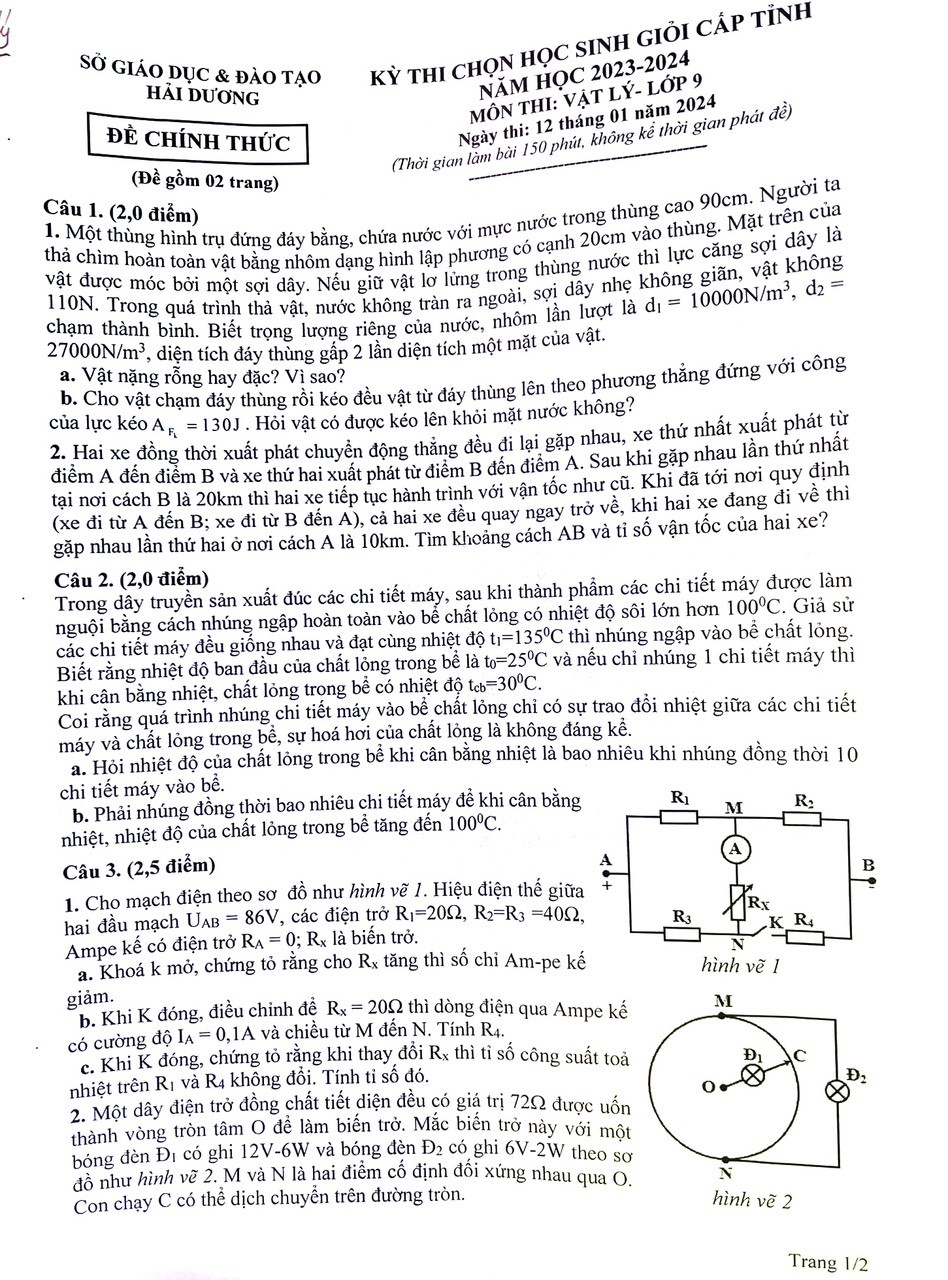 Đề thi chọn HSG môn Vật Lí lớp 9 tỉnh Hải Dương năm 2024