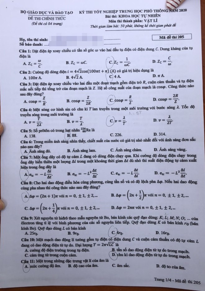 Đề thi tốt nghiệp THPT quốc gia môn Vật Lí năm 2020