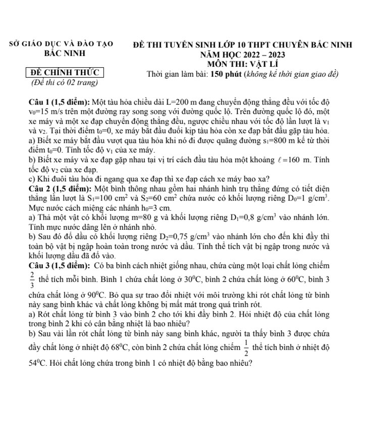 Đề thi tuyển sinh vào lớp 10 môn Vật Lí Trường THPT Chuyên Bắc Ninh năm 2022
