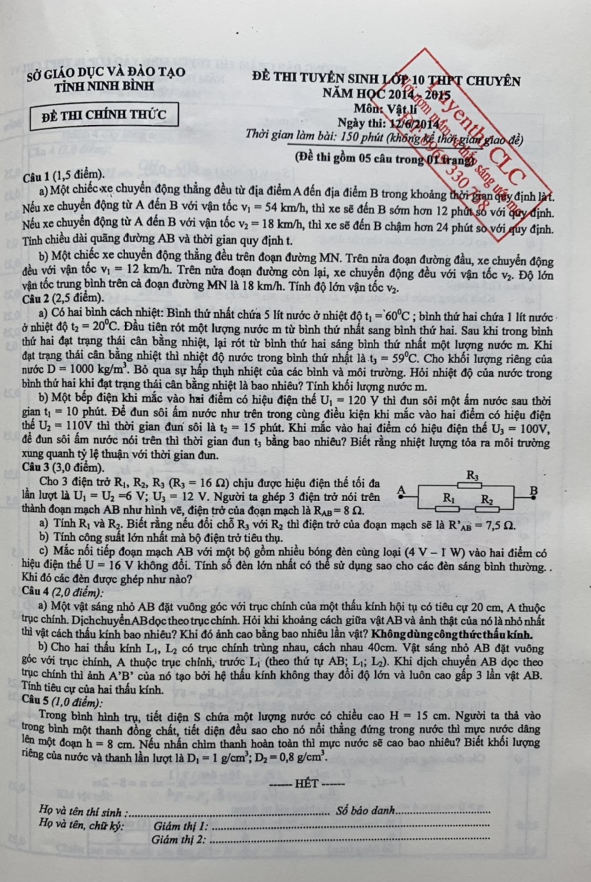 Đề thi tuyển sinh vào lớp 10 THPT CHUYÊN môn Vật Lí tỉnh Ninh Bình năm 2014