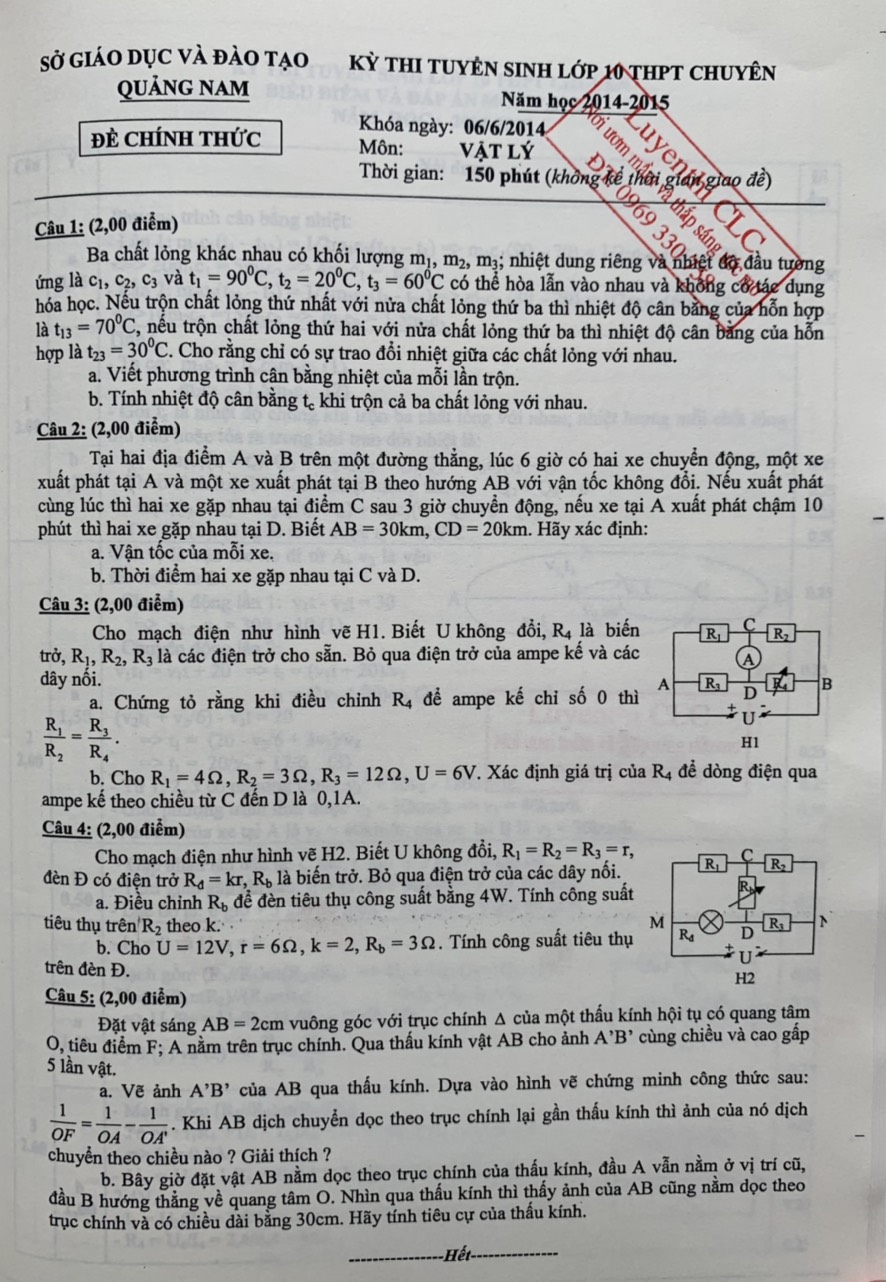 Đề thi tuyển sinh vào lớp 10 THPT CHUYÊN và đáp án môn Vật Lí tỉnh Quảng Nam năm 2014