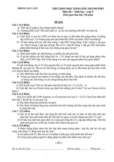 Đề thi chọn HSG thành phố môn Sinh học lớp 9
