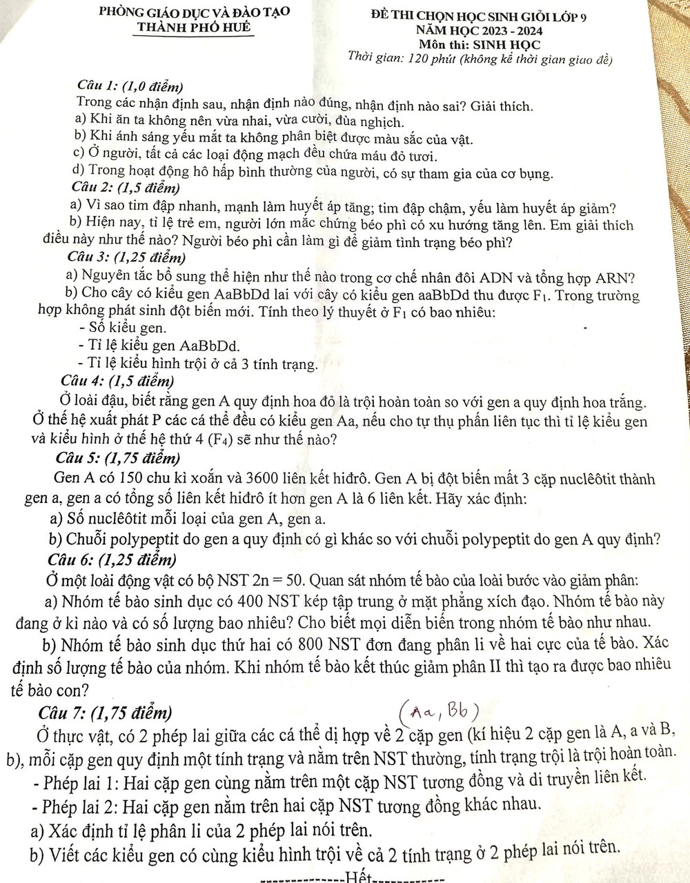 Đề thi chọn HSG môn Sinh học lớp 9 tại Huế năm 2023