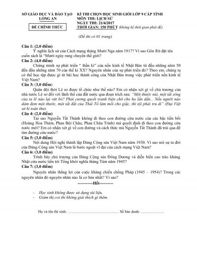 Đề thi chọn HSG cấp tỉnh lớp 9 và đáp án môn Lịch Sử tỉnh Long An năm 2017