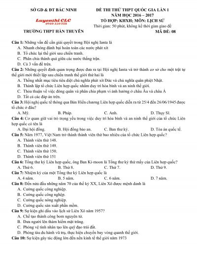 Đề thi thử THPT Quốc Gia môn Lịch Sử tỉnh Bắc Ninh năm 2017