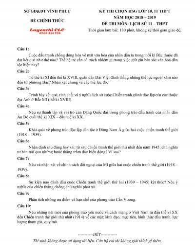 Đề thi chọn HSG môn Lịch Sử lớp 11 THPT tỉnh Vĩnh Phúc năm 2018