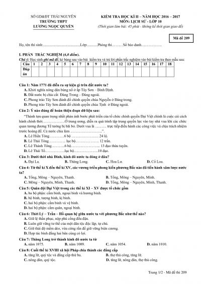 Đề kiểm tra học kì II môn Lịch Sử lớp 10 Trường THPT Lương Ngọc Quyến năm 2016, mã đề 209