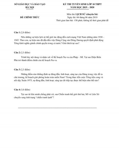 Đề thi tuyển sinh vào lớp 10 THPT môn Lịch Sử tại Hà Nội năm 2019