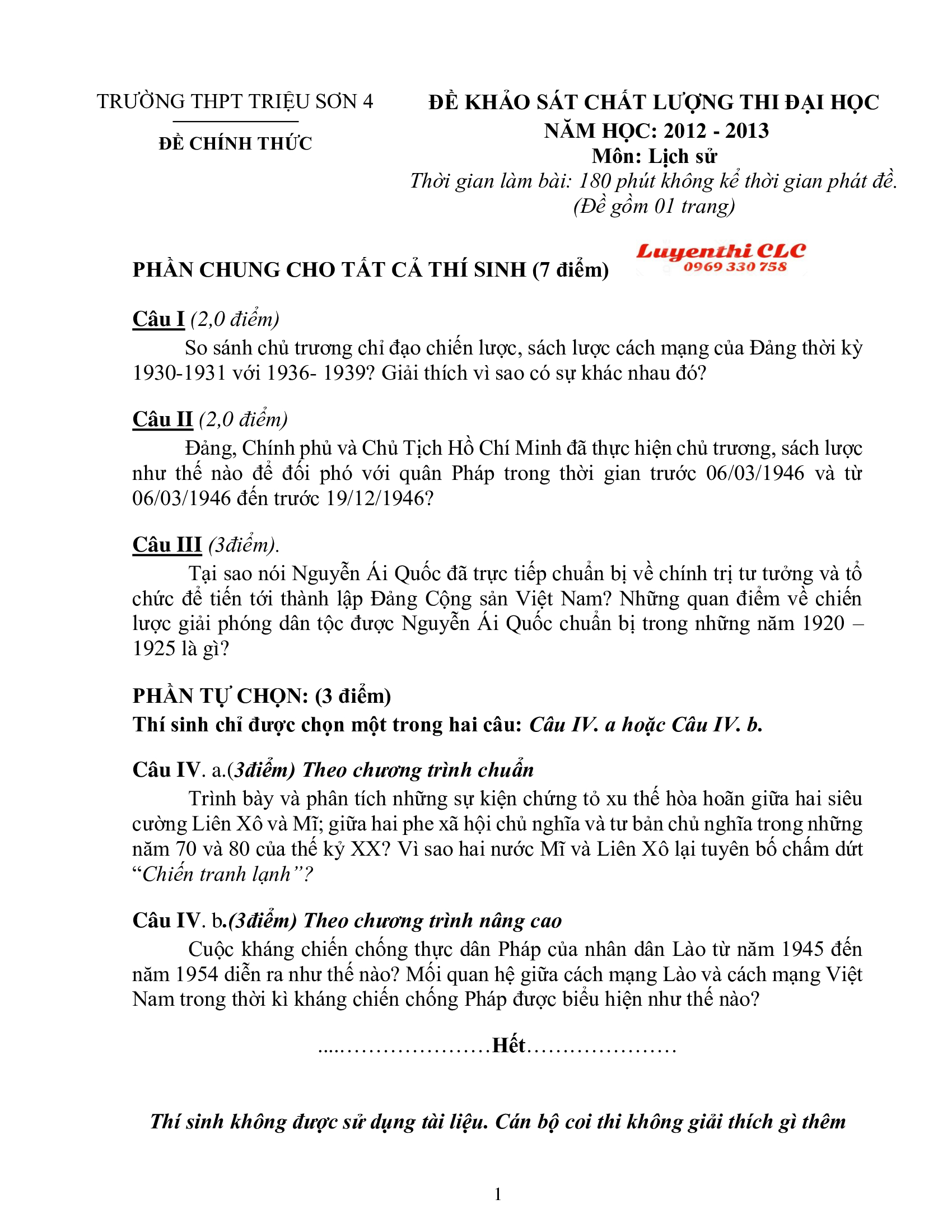 Đề khảo sát chất lượng thi đại học môn Lịch Sử, Trường THPT Thiệu Sơn 4 năm 2012