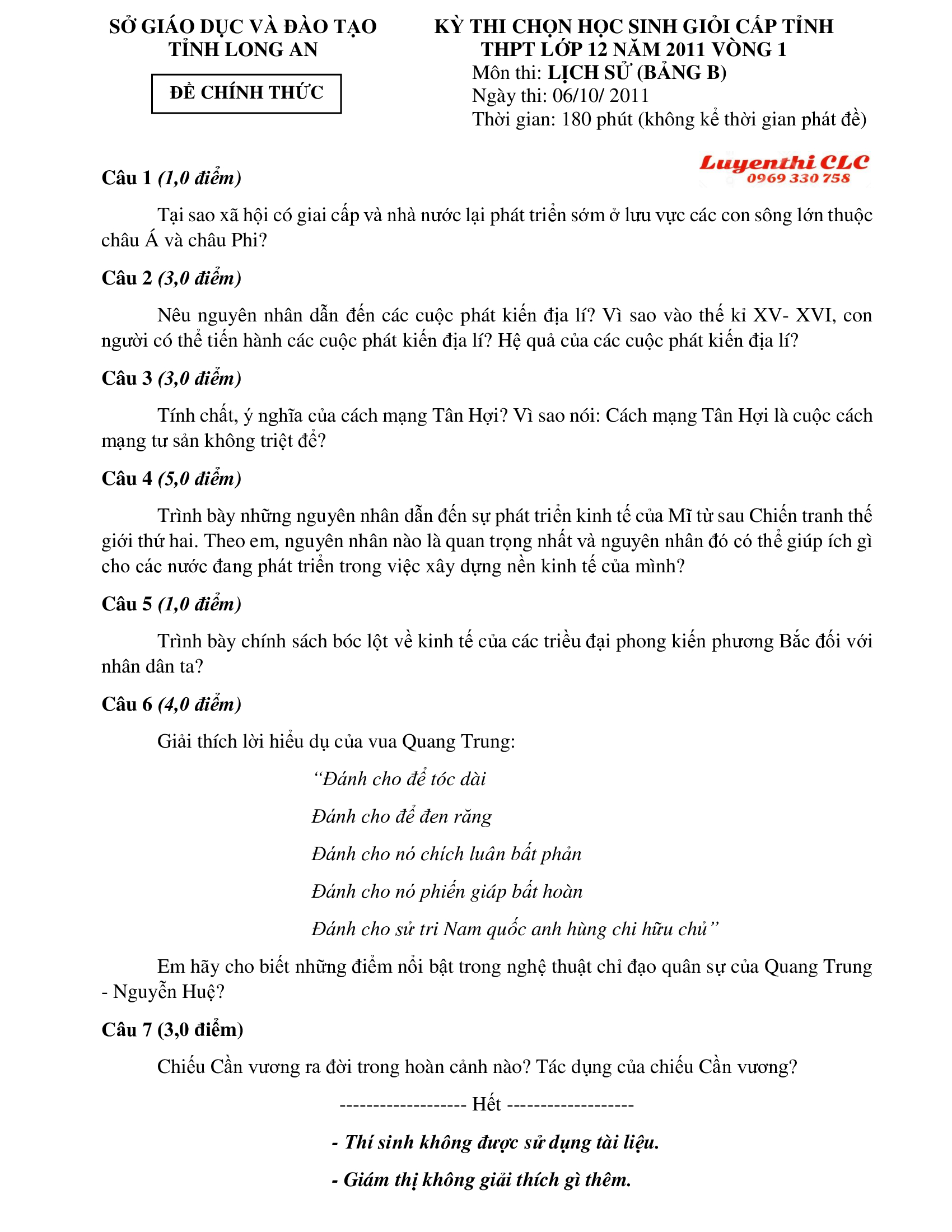 Đề thi chọn HSG cấp tỉnh lớp 12 THPT môn Lịch Sử (Bảng B) - vòng 1 tỉnh Long An năm 2011