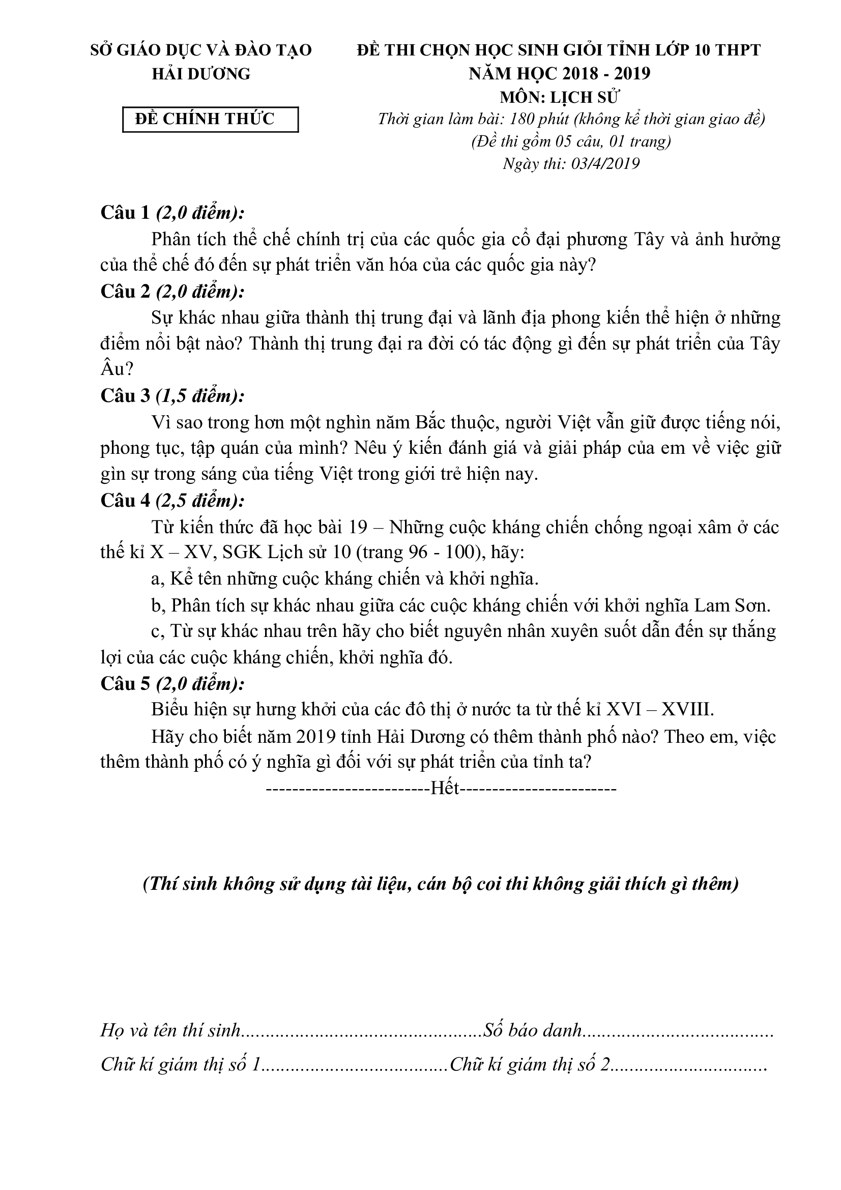 Đề thi chọn HSG Tỉnh lớp 10 THPT môn Lịch Sử tỉnh Hải Dương năm 2019