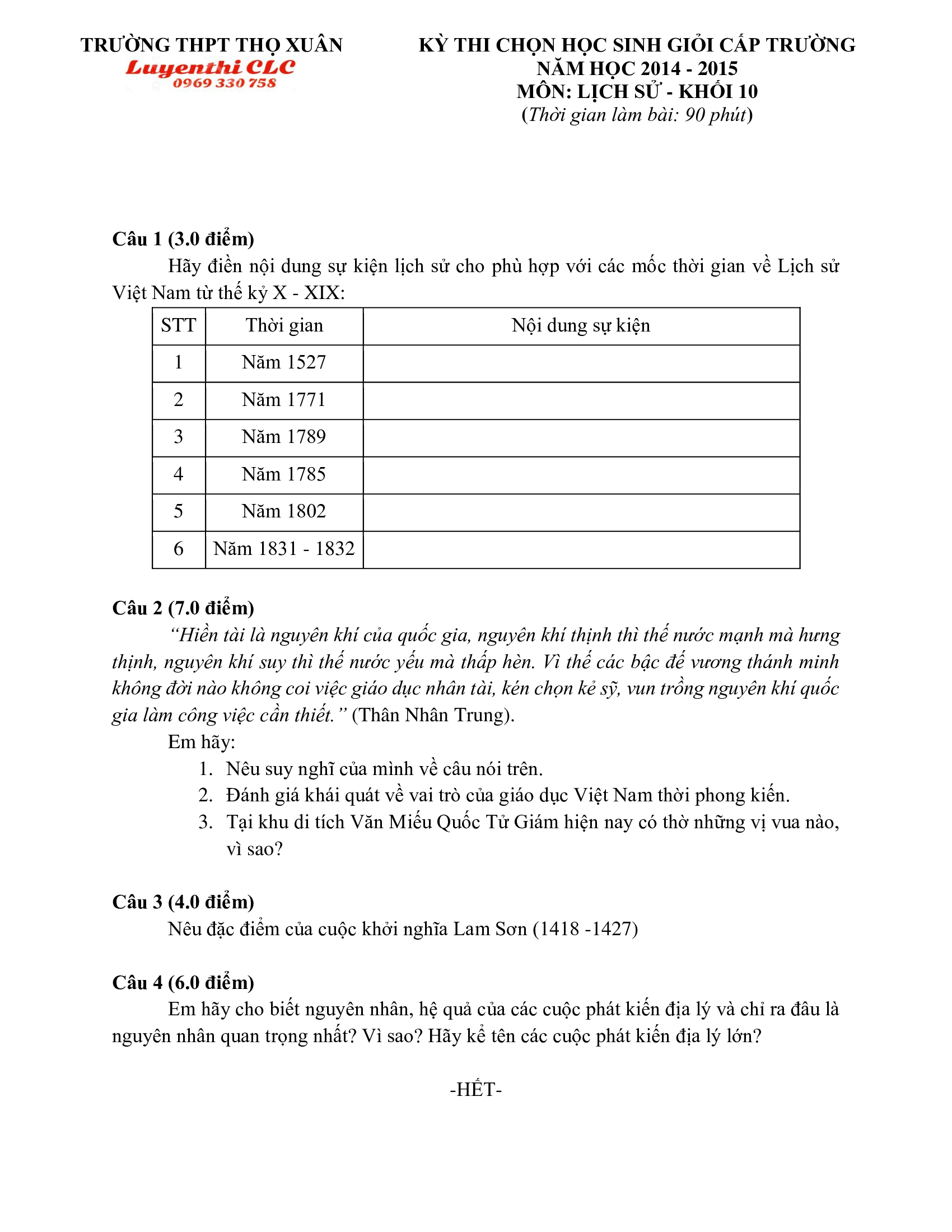 Đề thi chọn HSG và đáp án môn Lịch Sử lớp 10 Trường THPT Thọ Xuyên tỉnh Thanh Hóa năm 2015