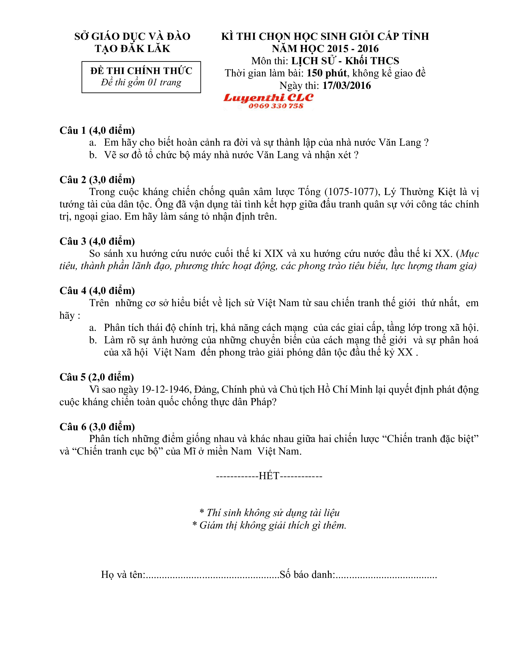 Đề thi HSG cấp tỉnh môn Lịch Sử khối THCS - lần 2 tỉnh Đắk Lắk năm 2016