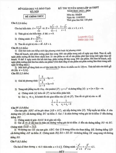 Đề thi tuyển sinh vào lớp 10 môn Toán Trường THPT CHUYÊN Khoa học Xã hội và Nhân văn Hà Nội năm 2023