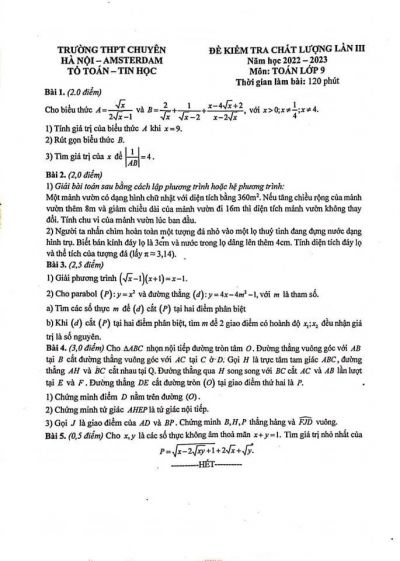 Đề kiểm tra chất lượng lần V môn Toán lớp 9 Trường THPT CHUYÊN Hà Nội - Amsterdam năm 2023