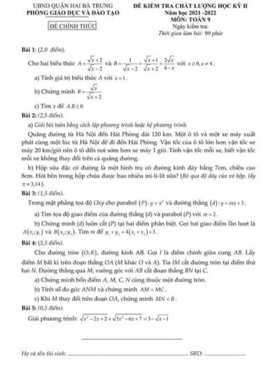 Đề thi tuyển sinh vào lớp 10 THPT môn Toán ( Chuyên Toán ) tại Hà Nội năm 2022