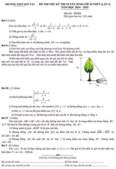 Đề thi và đáp án vào lớp 10 THPT môn Toán trường THPT Nguyễn Tất Thành năm 2024-2025