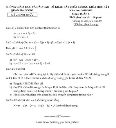 Đề kiểm tra KSCL giữa kì I môn Toán lớp 7 quận Hà Đông năm 2017