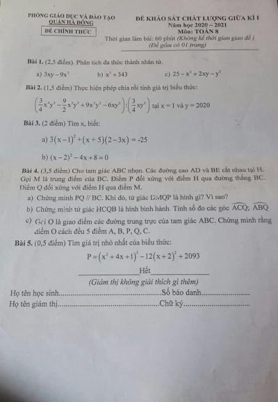Đề kiểm tra giữa học kì I môn Toán lớp 8 quận Ba Đình năm 2019