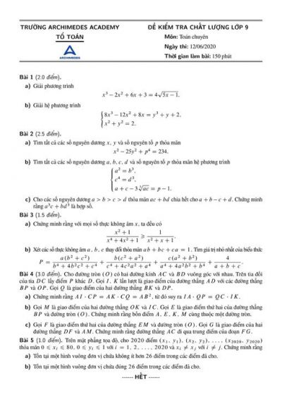 Đề kiểm tra môn Toán 9 Trường Archimedes Academy, ngày 15/05/2020